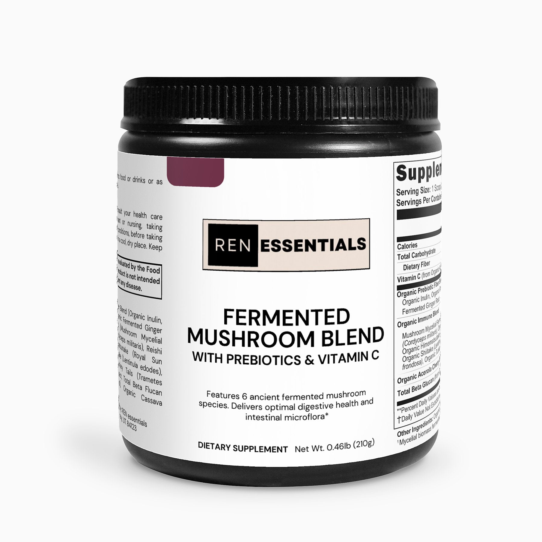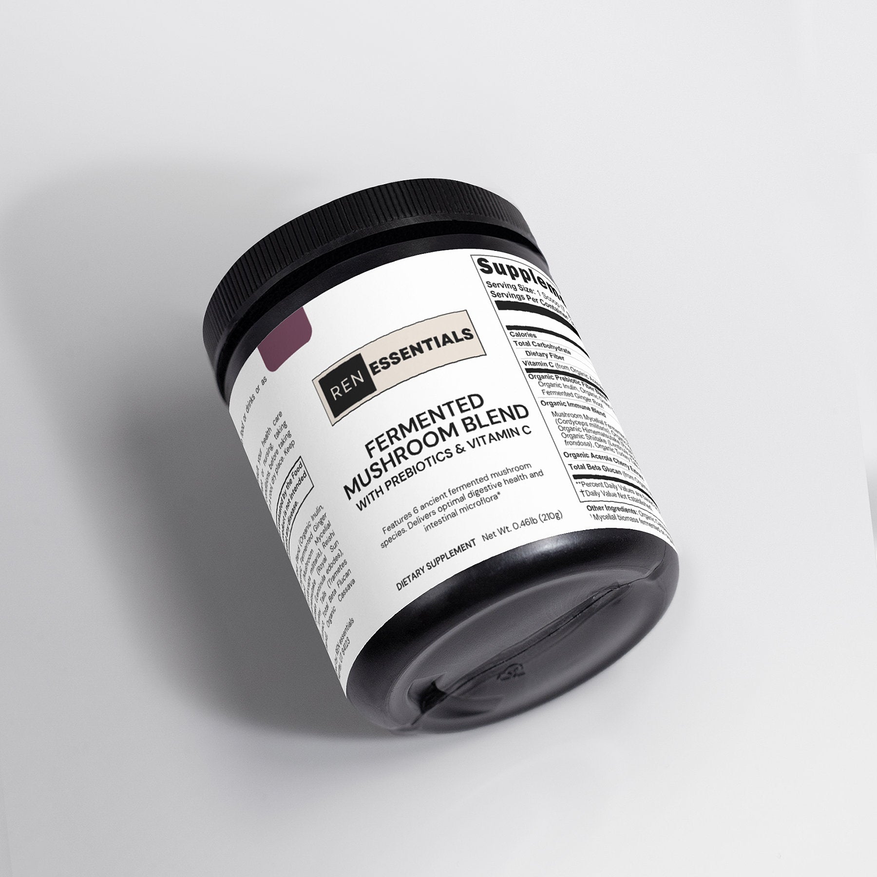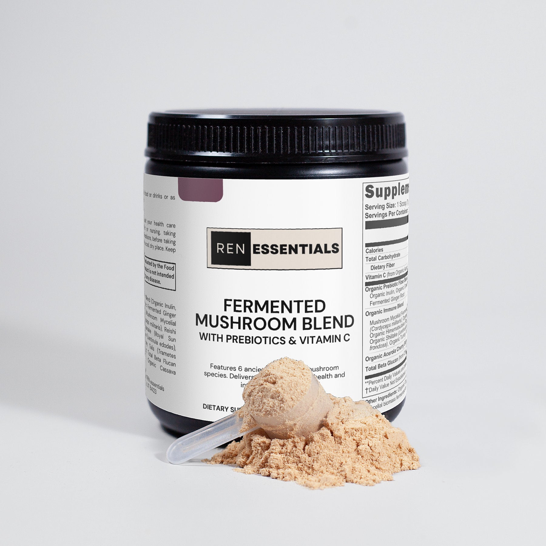 Ingredients: Vitamin C, Organic Prebiotic Fiber Blend (Organic Inulin, Organic Green Tea Extract, Organic Fermented Ginger Root), Organic Immune Blend (Mushroom Mycelial Biomass Blend,[Cordyceps (Cordyceps militaris), Reishi (Ganoderma lucidum), Himematsutake (Royal Sun Agaricus) (Agaricus blazei), Shiitake (Lentinula edodes), Maitake (Grifola frondosa), Turkey Tails (Trametes versicolor)], Acerola Cherry Extract, Total Beta Flucan (from Organic Immune Blend), Organic Cassava Maltodextrin