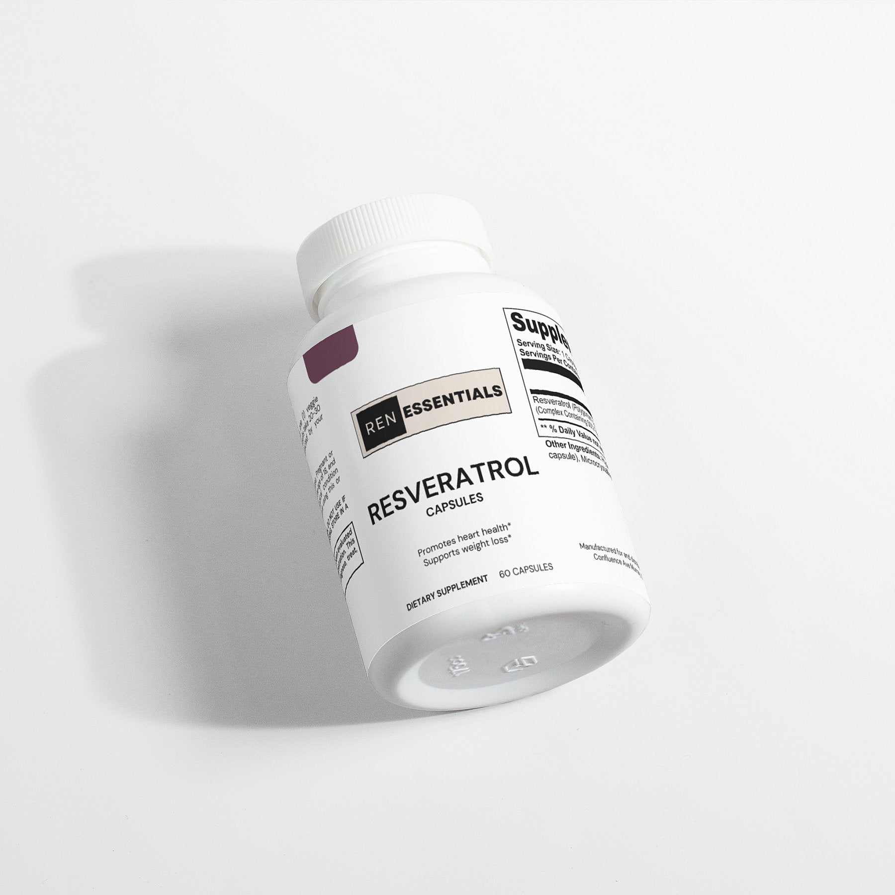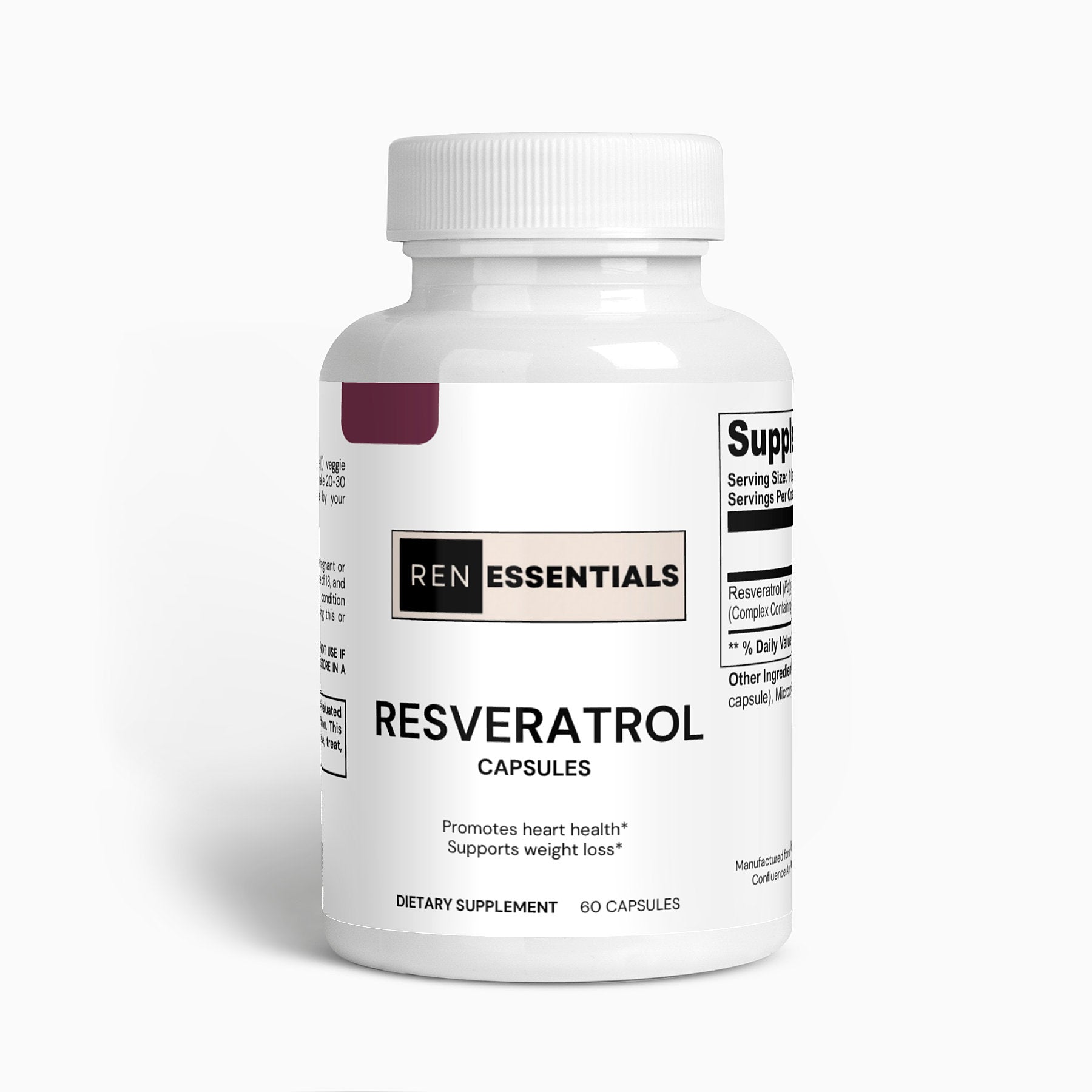 Ingredients: Resveratrol (Polygonum cuspidatum)(root) Complex Containing 50% Trans-Resveratrol, Vegetable Capsule (Cellulose), Microcrystalline Cellulose.